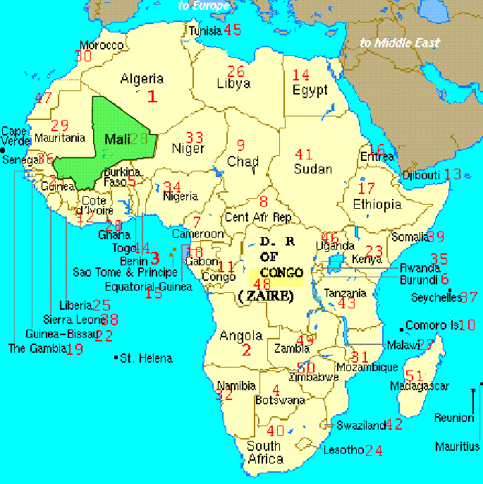 Jeśli nie wiesz gdzie leży Mali może pomóc Ci rzut oka na prościutką mapkę Afryki.